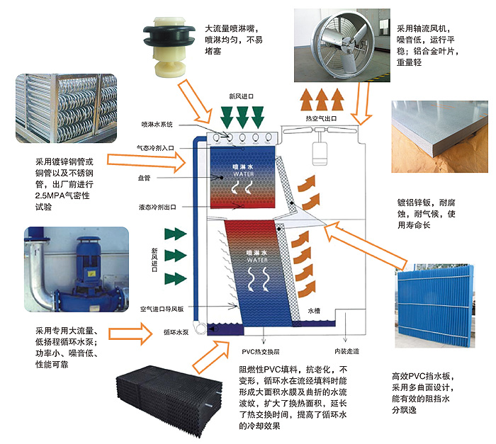 蒸發(fā)式冷凝器是制冷、空調(diào)系統(tǒng)中的主要熱交換設(shè)備,其工作原理是:制冷、空調(diào)系統(tǒng)中壓縮機(jī)拍出的制冷劑高壓過熱氣體經(jīng)過蒸發(fā)式冷凝器中的冷凝排管,使高壓高溫氣態(tài)的制冷劑與排管外的噴淋水和空氣進(jìn)行熱交換,即氣態(tài)制冷劑由上部進(jìn)氣口進(jìn)入冷凝排管后自上而下逐漸被冷凝成為液態(tài)制冷劑。